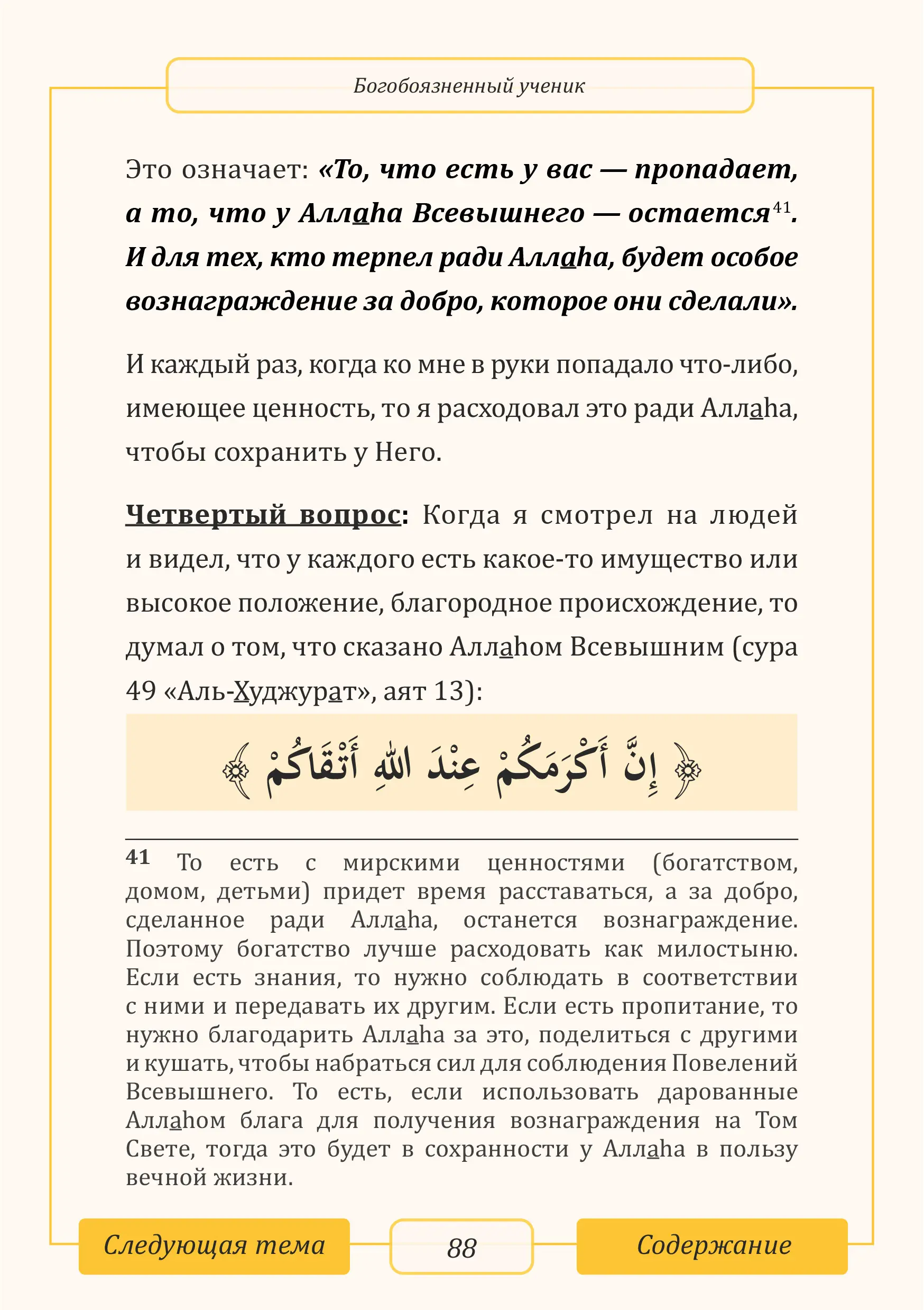 Опис: Справжнє багатство залишиться з людиною у вічному житті — це винагорода, яку вона отримає за виконані фарди (обов’язки в Релігії) та інші добрі справи, здійснені щиро заради Всевишнього! Тому в інтересах кожної людини прагнути робити якомога більше добрих справ, обираючи за пріоритетом ті, що принесуть більшу винагороду.